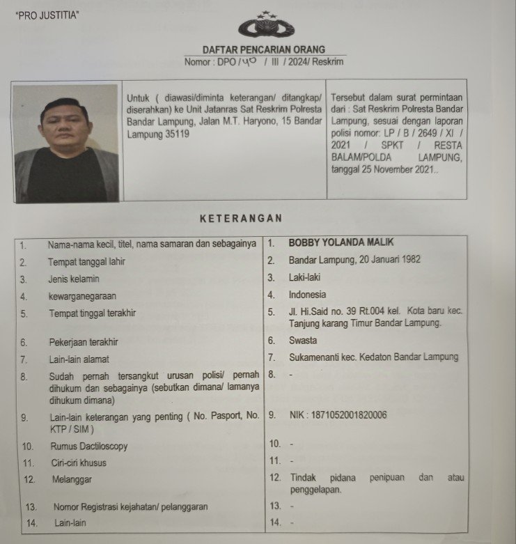 BANDAR LAMPUNG, BP – Satuan Reserse Kriminal (Satreskrim) Polresta Bandarlampung telah menerbitkan Daftar Pencarian Orang (DPO) terhadap seorang pria bernama Bobby Yolanda Malik. Diduga sebagai pelaku tindak pidana Penipuan dan/atau Penggelapan berdasarkan Pasal 378 KUHP dan/atau Pasal 372 KUHP.