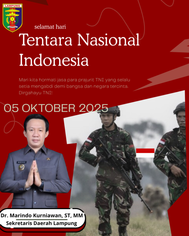 Lampung, berita-public.com – Dr. Marindo Kurniawan, ST, MM, Sekretaris Daerah Provinsi Lampung Mengucapkan Selamat Dirgahayu Tentara Nasional Indonesia Ke-80.