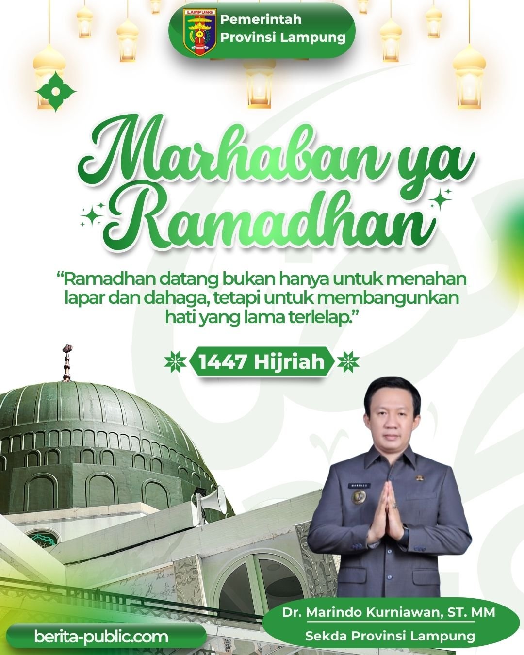 Lampung, berita-public.com – Dr. Marindo Kurniawan, ST, MM, Sekretaris Daerah Provinsi Lampung mengucapkan selamat menunaikan ibadah Puasa Ramadhan 2026.