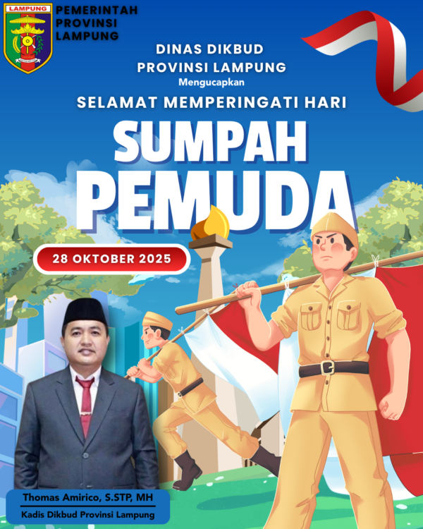 Lampung, berita-public.com – Kepala Dinas Pendidikan dan Kebudayaan Provinsi Lampung, Thomas Amirico, S.Stp, MH mengucapkan Selamat Hari Sumpah Pemuda Tahun 2025.