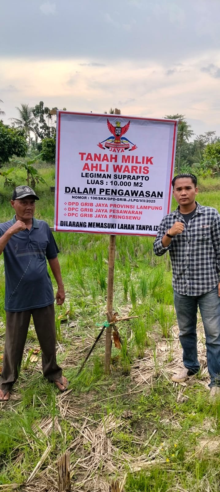 Sebagai LPH DPD Grib Jaya Provinsi Lampung.dan dampingi oleh DPC Kab. Pesawaran yang di wakili oleh Ihmadin dan DPC kab. Pringsewu Edi Erwanto beserta jajaran nya. pada dini hari pukul 15:00 Wib. mendampingi ahli waris untuk menguasi lahan dan pemasangan bener sebagai tanda lahan milik pak Legiman sebagai ahli waris yang sah.